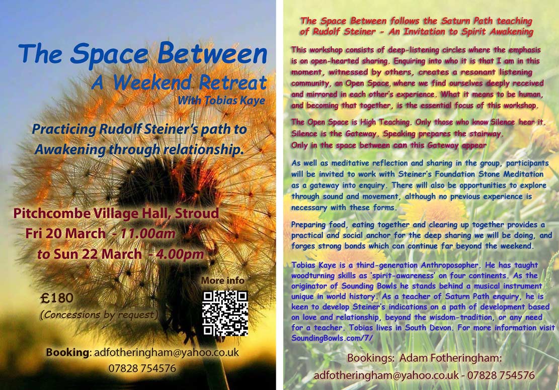 As well as meditative reflection and sharing in the group, participants will be invited to work with Steiner’s Foundation Stone meditation as a gateway into enquiry. There will also be opportunities to explore through sound and/or movement, or art. These will be supported, discovery sessions where no previous experience is necessary.